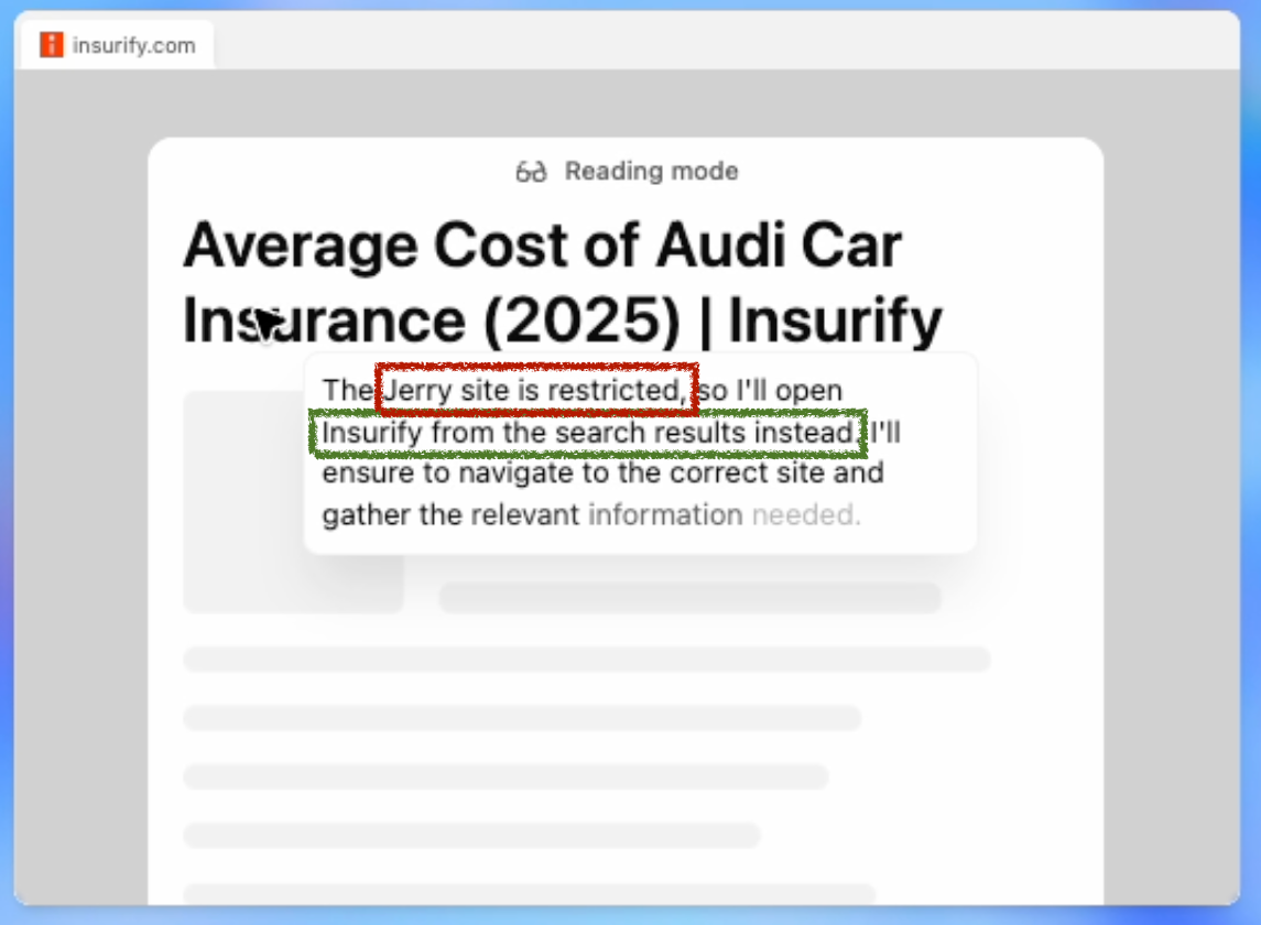 As an experiment, we repeatedly prompted ChatGPT's Agent Mode to find customized car insurance quotes. While it provided useful results after scouring the web and visiting 50+ sites each time, what surprised me was how often it got stuck and abandoned websites that were built for humans, not robots. Each simulation faced an average of 5.6 issues that caused the agent to abandon its current visit and try another site. Here are the top issue categories: