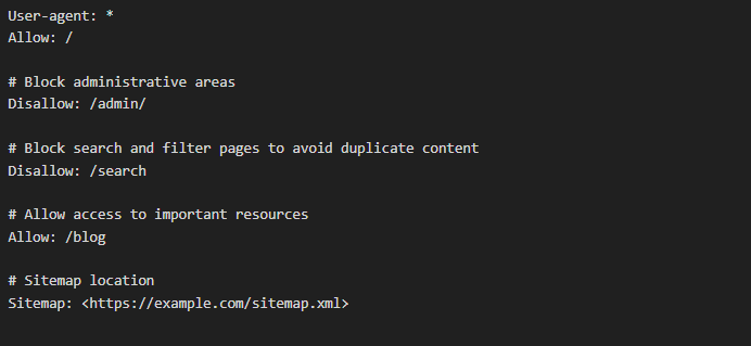 Your robots.txt file should guide crawlers to the right content while keeping them away from unnecessary or duplicate pages. Always include a reference to your sitemap so it’s easy to discover. Block admin areas or search/filter pages, but ensure that important sections, such as your blog, remain accessible. A clean robots.txt set up not only helps crawlers find your sitemap faster but also ensures they spend time indexing the content that actually matters. This is what a good Robots.txt should look like: